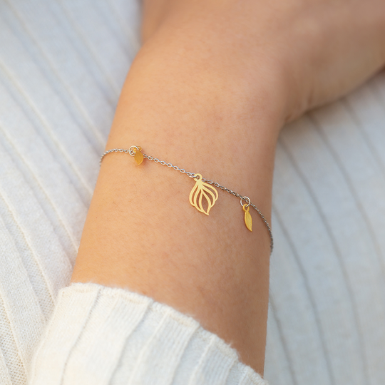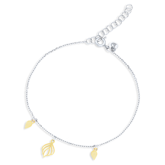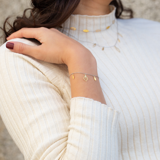 Pulseira com fio em prata e três pendentes em prata dourada com acabamento polido. Pulseira Silvestre da colecção Nativa da Dlight. A Dlight é uma marca de design original do Lugar da Jóia com uma embalagem sustentável que contém sementes de camomila para plantar.