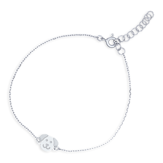 Pulseira de criança com medalha em forma de cão sorridente em prata. Para os verdadeiros amigos dos caninos.