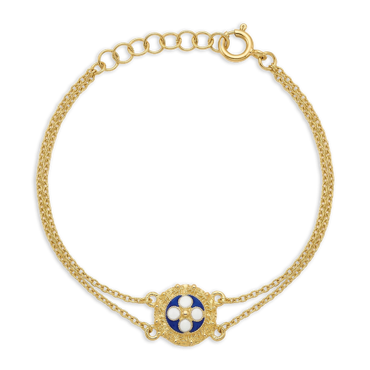 Pulseira em prata dourada com caramujo central e detalhe em esmalte azul e branco. Um modelo delicado que combina tradição e elegância, perfeito para dar um toque de cor ao pulso.