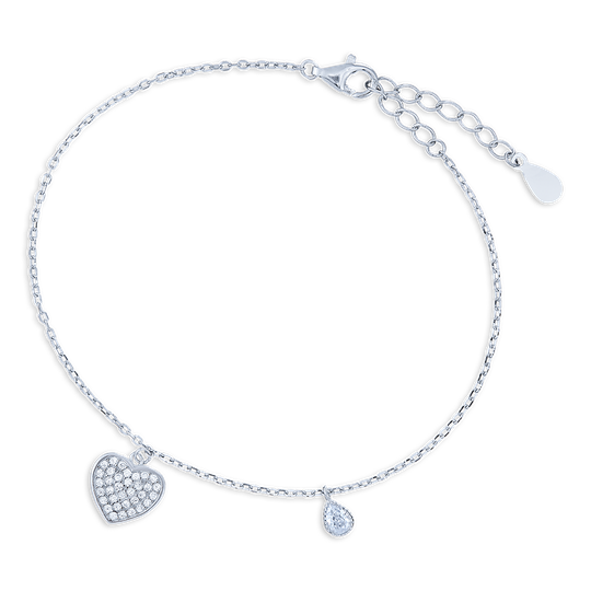 Pulseira em prata com coração e gota com zircónias. Pulseira ajustável.