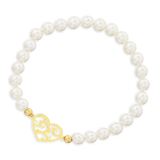 Pulseira com pérolas e medalha em prata dourada em forma de coração com pormenores recortados. Pulseira elástica, sem fecho.