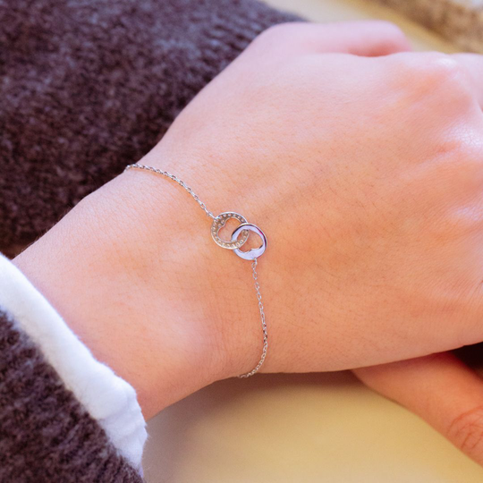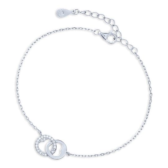 Pulseira em prata com dois corações ligados, um deles com zircónias. Pulseira ajustável.