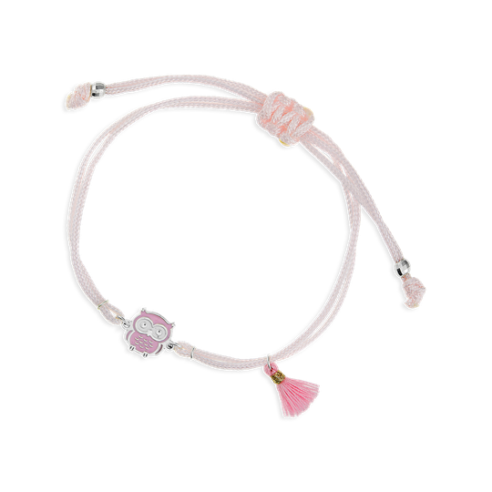 Com pendente em prata em forma de coruja, esta pulseira de fio de algodão rosa-claro ajustável com lacinho rosa é um presente delicado e cheio de ternura.