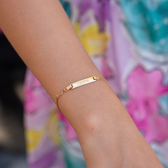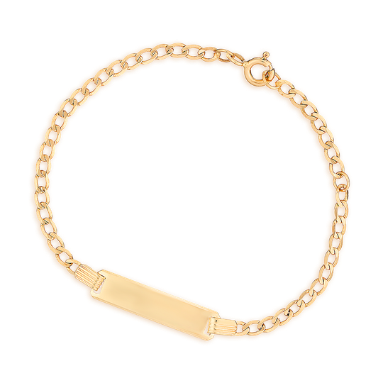 Pulseira de criança em ouro de 9 quilates com chapinha que pode ser gravada com nomes, datas ou mensagens. Permite apertar em duas posições. Um bonito presente nos primeiros anos de vida.