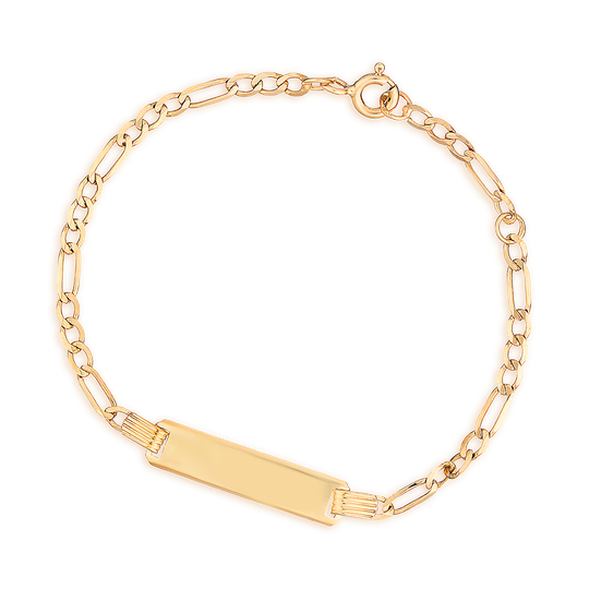 Pulseira de criança em ouro de 9 quilates com chapinha que pode ser gravada com nomes, datas ou mensagens. Permite apertar em duas posições. Um bonito presente nos primeiros anos de vida.