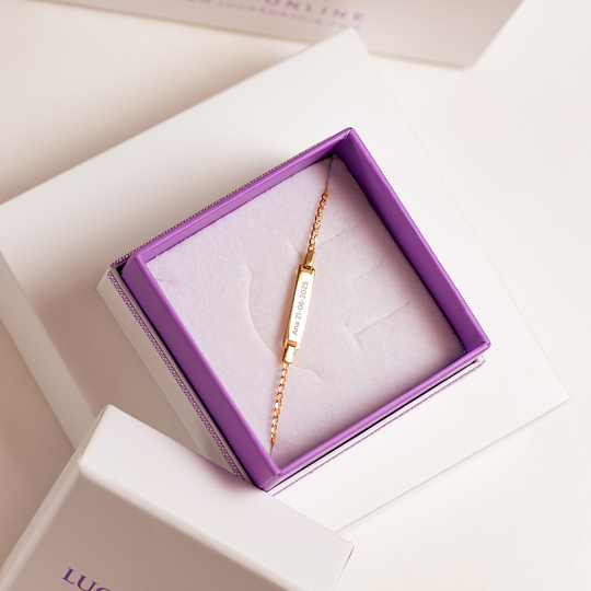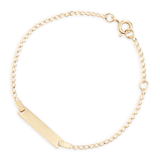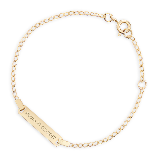Pulseira de criança em ouro de nove quilates com chapinha para gravação. Pulseira ajustável. Um bonito presente nos primeiros anos de vida.