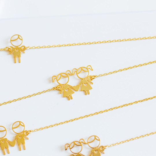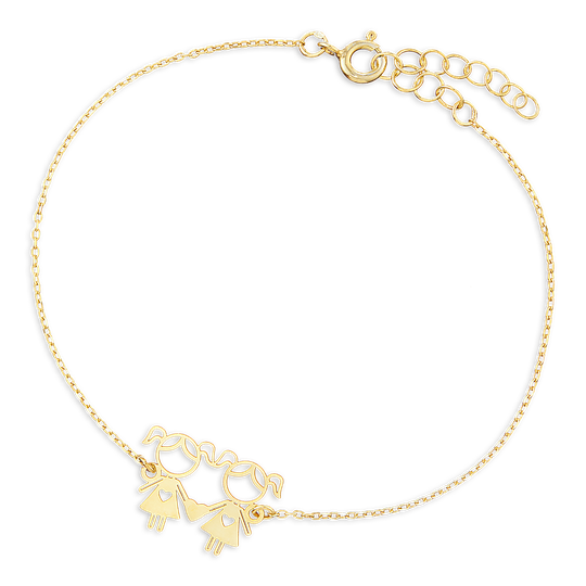 Pulseira em prata dourada com duas meninas recortadas. Pulseira ajustável. Adorável presente para mães, tias ou avós. Original e exclusivo Lugar da Jóia.