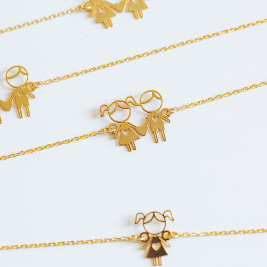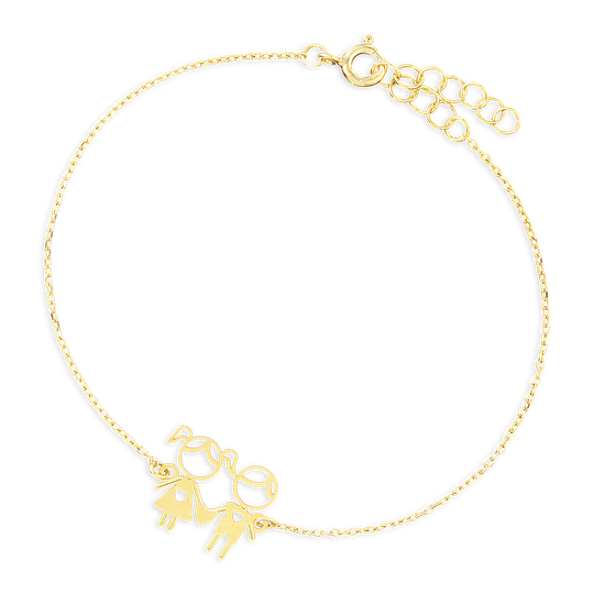 Pulseira em prata dourada com menino e menina recortados. Pulseira ajustável. Adorável presente para mães, tias ou avós.Original e exclusivo Lugar da Jóia.