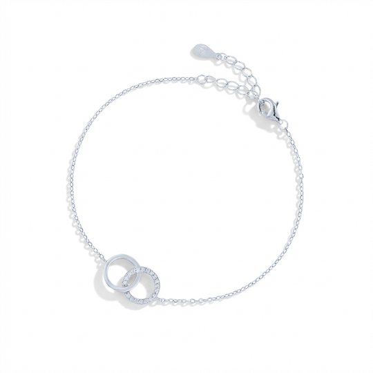 Pulseira em prata com dois elos entrelaçados, sendo um deles totalmente cravado com zircónias. Um símbolo de ligação eterna, com um toque de brilho delicado.