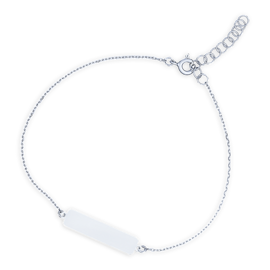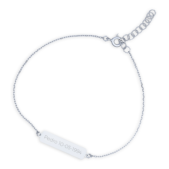 Pulseira em prata com chapa rectangular personalizável. Use o campo personalização para escrever o que pretende gravar (até 18 caracteres). O envio é realizado no prazo de dois dias úteis.