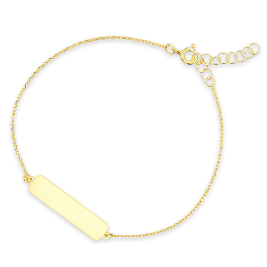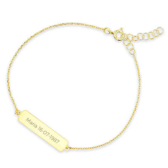 Pulseira em prata dourada com chapa rectangular personalizável. Use o campo personalização para escrever o que pretende gravar (até 18 caracteres). O envio é realizado no prazo de dois dias úteis.