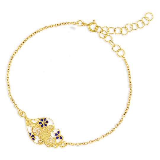 Pulseira de filigrana em prata dourada com coração de Viana com detalhes azuis. Fio ajustável.