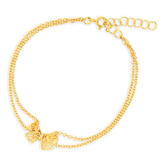 Pulseira em prata dourada com pendente em forma de laço em filigrana com volume gracioso. Fio duplo que corre dentro do laço, ajustável.