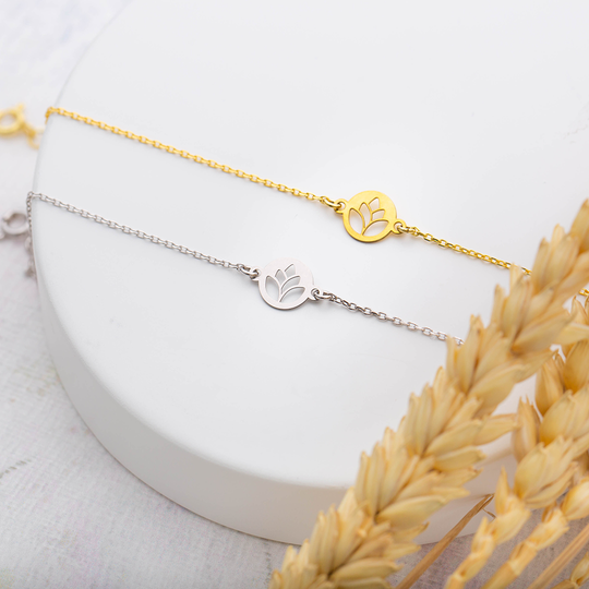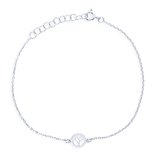 Pulseira em prata 925 com medalha redonda com lótus recortado. A Dlight é uma marca de design original do Lugar da Jóia. Receba a sua jóia Dlight numa embalagem sustentável que contém sementes de camomila para plantar e cuidar.