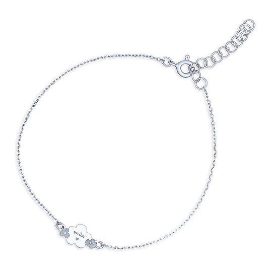 Pulseira em prata com pendente em forma de flor com duas folhinhas, com gravação da palavra “Mãe”. Uma bonita surpresa para as mães.