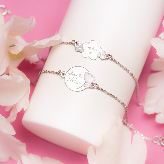 Pulseira em prata com pendente redondo com pequena flor e com gravação da palavra “Mãe”. Uma bonita surpresa para as mães.