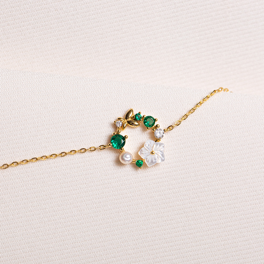 Inspirada numa delicada grinalda, esta pulseira em prata dourada combina madrepérola, pérola de água doce e pedras verdes. Um toque romântico da coleção À Flor da Pele, feita para despertar emoções.
