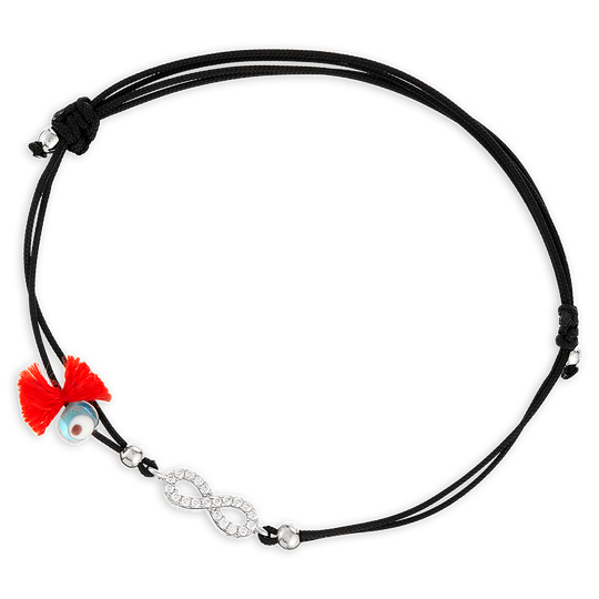 Pulseira com pendente infinito em prata com zircónias, pequeno olho turco e lacinho de algodão vermelho. Pulseira de fio de algodão preto ajustável.