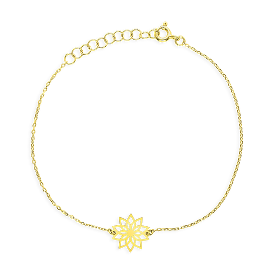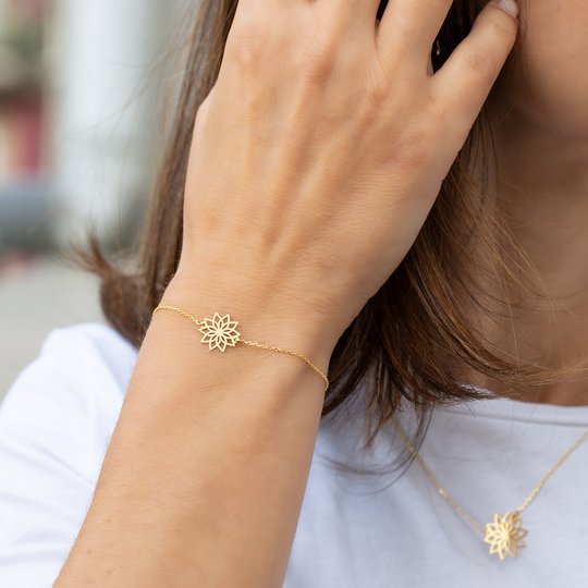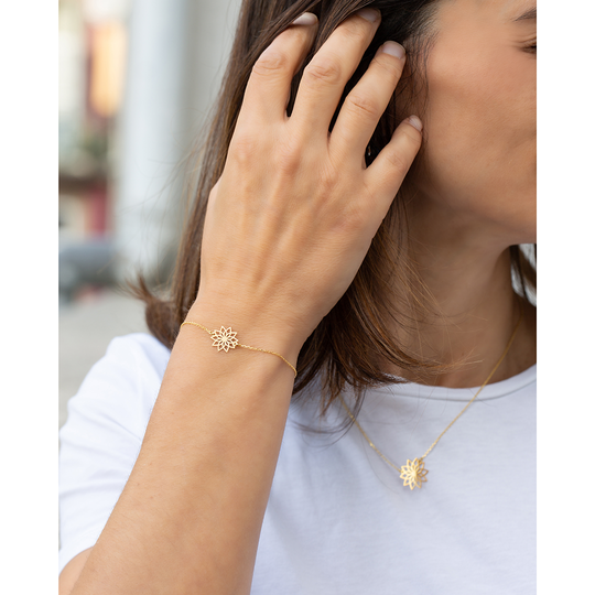 Pulseira em prata dourada com flor de lótus. A Dlight é uma marca de design original do Lugar da Jóia. Receba a sua jóia Dlight numa embalagem sustentável que contém sementes de camomila para plantar e cuidar.