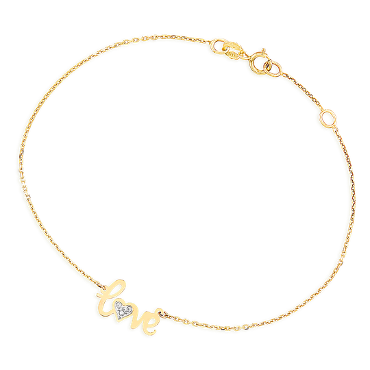 Pulseira em ouro de 9 quilates com palavra "love" com zircónias no "o" em formato de coração.