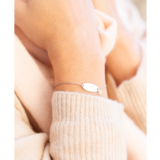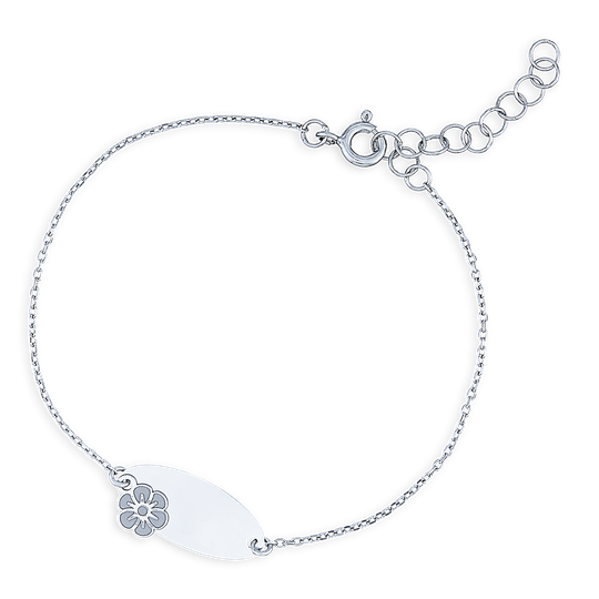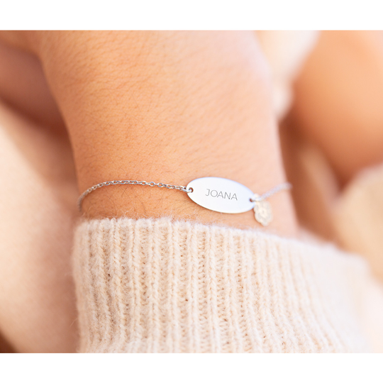 Pulseira em prata com chapinha para gravar e pequena medalha flor. Pulseira ajustável.