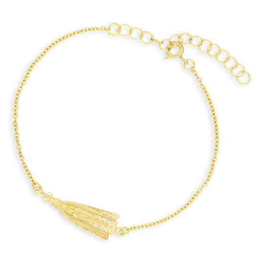 Pulseira em prata dourada com medalha de Nossa Senhora em filigrana. Pulseira ajustável, com formas subtis.