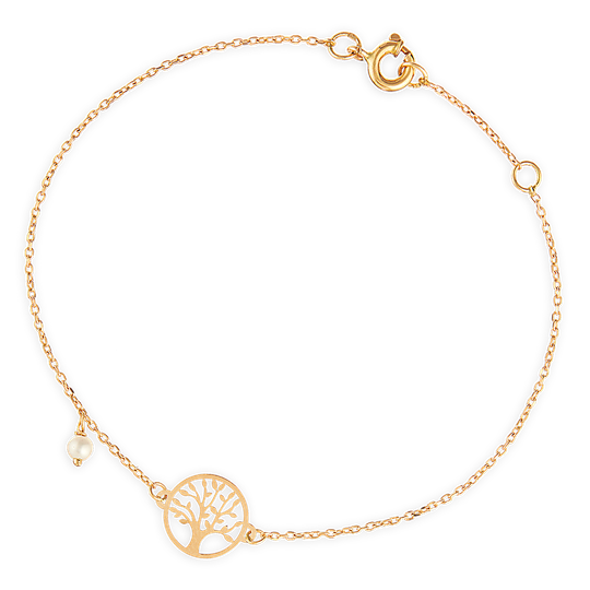Pulseira em ouro de 19,2 quilates com árvore da vida recortada e pendente com pequena pérola de água doce. Pulseira ajustável.