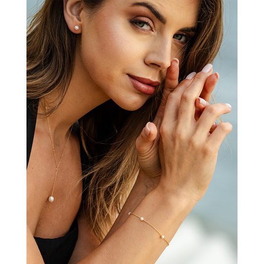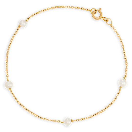 Pulseira em ouro de 19,2 quilates combina uma corrente delicada com pequenas pérolas de água doce distribuídas ao longo do fio, criando um visual leve, feminino e sofisticado.
