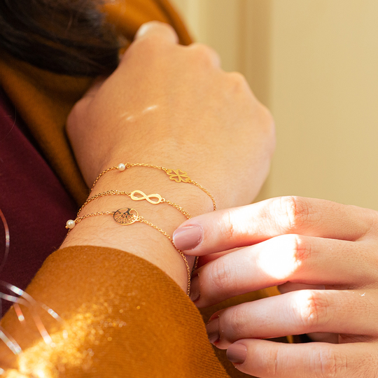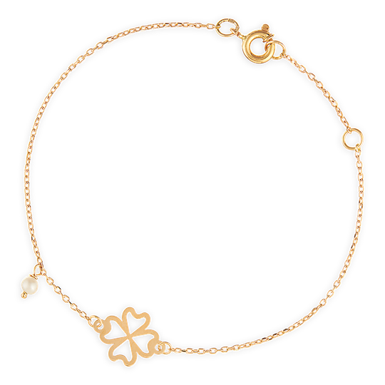 Pulseira em ouro de 19,2 quilates com trevo recortado e pendente com pequena pérola de água doce. Pulseira ajustável.