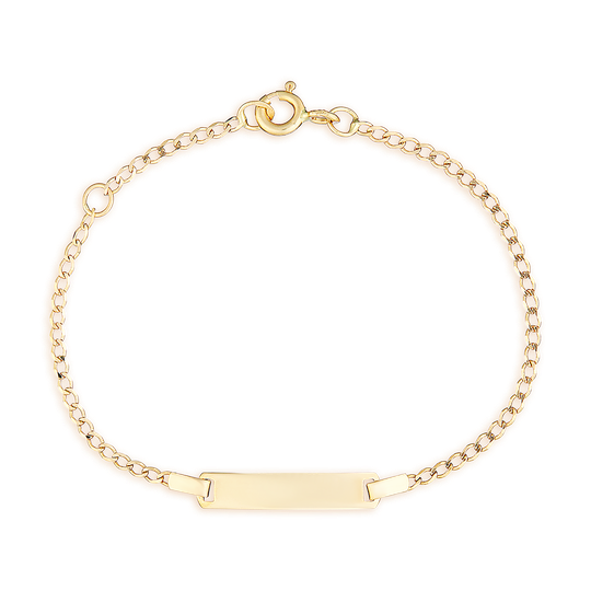 Pulseira de criança em ouro de 19,2 quilates com placa para gravar mensagem. Ajustável aos 12,5 cm. Ideal para as celebrações dos primeiros anos.