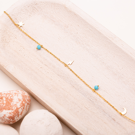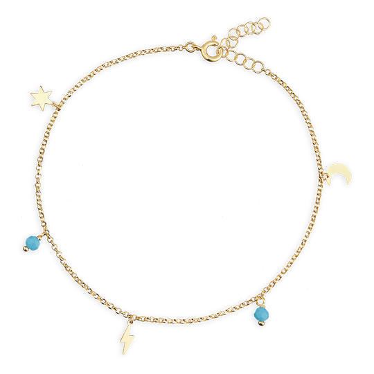 Pulseira para pé em prata dourada com cinco pendentes: uma lua, um raio, uma estrela e duas gemas sintéticas azul céu. Pulseira ajustável.