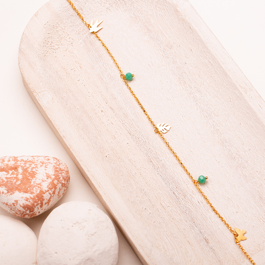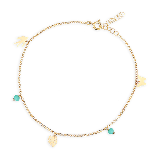 Pulseira para pé em prata dourada com cinco pendentes: uma andorinha, uma folha de palma, uma borboleta e duas gemas sintéticas verde água. Pulseira ajustável.