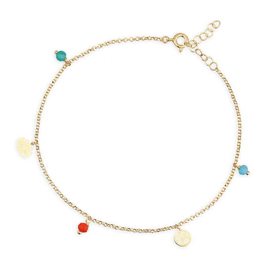 Pulseira para pé em prata dourada com cinco pendentes: um olho turco, uma árvore da vida e três gemas sintéticas coloridas. Pulseira ajustável.