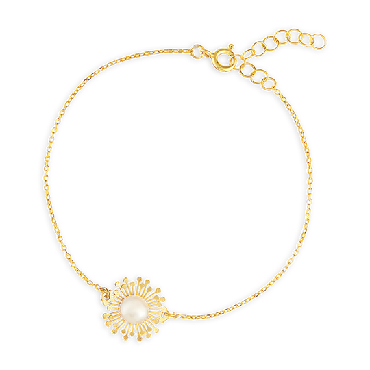 Pulseira em prata dourada com pendente em forma de flor delicada com pérola de água doce. Fio ajustável.