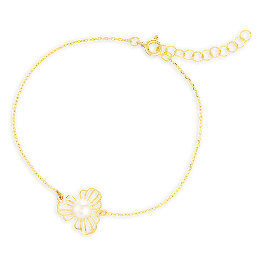 Pulseira em prata dourada em forma de flor de três pétalas com pérola de água doce. Fio ajustável.