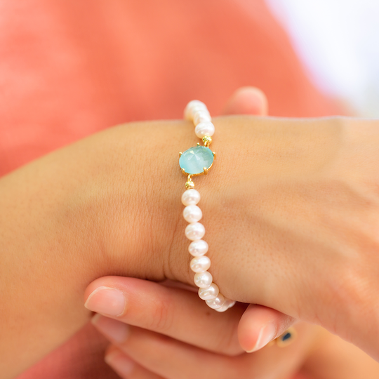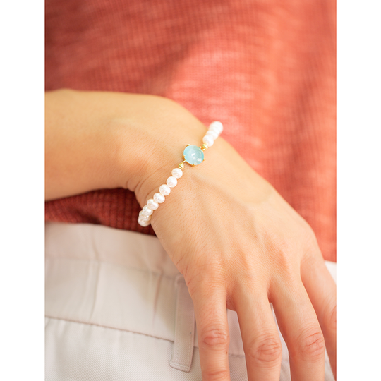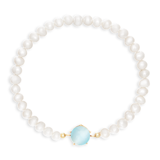 Pulseira em prata dourada e pérolas com medalha arredondada com zircónia azul céu. Pulseira elástica e ajustável, sem fecho. Calor a Cores é uma coleção de jóias de tons dourados e cores brilhantes.