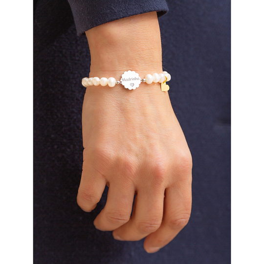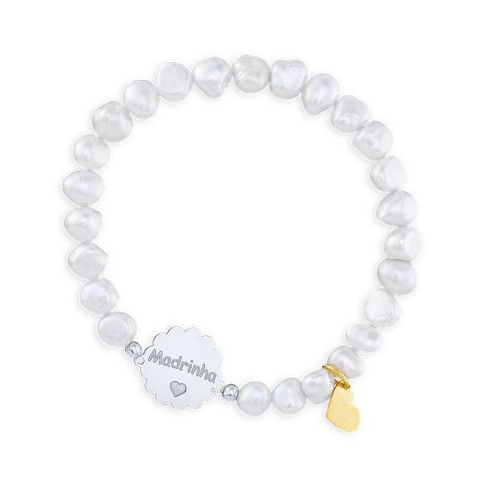Pulseira de pérolas com medalha em prata com a palavra Madrinha e pendente em forma de coração em prata dourada. Pulseira elástica, sem fecho. Um presente para uma Madrinha querida.