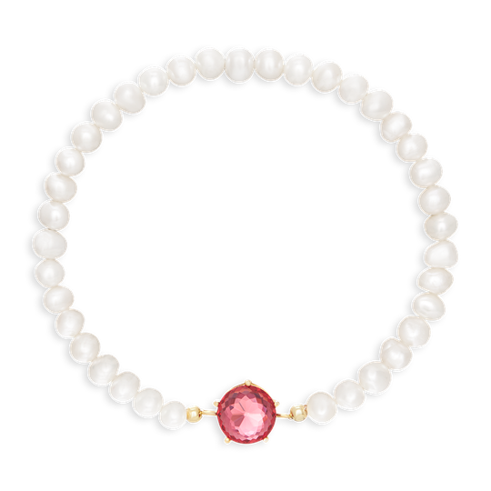 Pulseira em prata dourada e pérolas com medalha arredondada com zircónia vermelho romã. Pulseira elástica e ajustável, sem fecho. Calor a Cores é uma coleção de jóias de tons dourados e cores brilhantes.