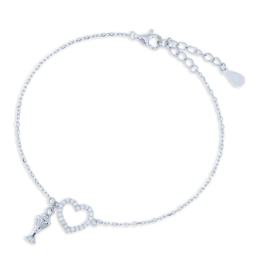 Pulseira em prata com coração recortado com zircónias e pequeno cálice. Pulseira ajustável. Bonita oferta de Primeira Comunhão.