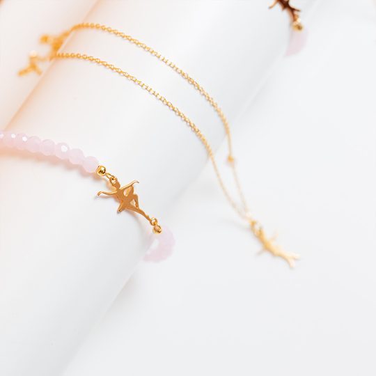 Pulseira com gemas rosa e pendente bailarina em prata dourada. Pulseira elástica, sem fecho. Uma criação do Lugar da Jóia.