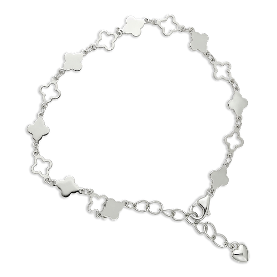 Pulseira em prata com delicados trevos ao longo da corrente. Um modelo elegante e intemporal que acrescenta um toque de charme e leveza ao pulso