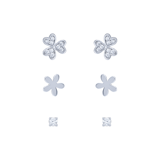 Conjunto de três pares de pequenos brincos em prata com zircónias. Flor com zircónias 6X6mm; Flor 5X5mm; Ponto de luz 2X2mm. Brincos com fecho de espeque.
