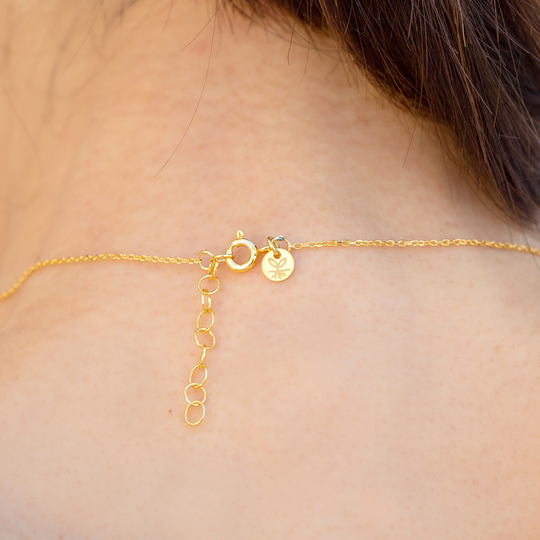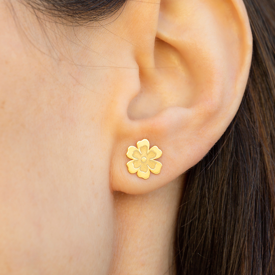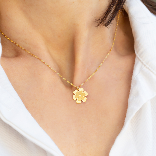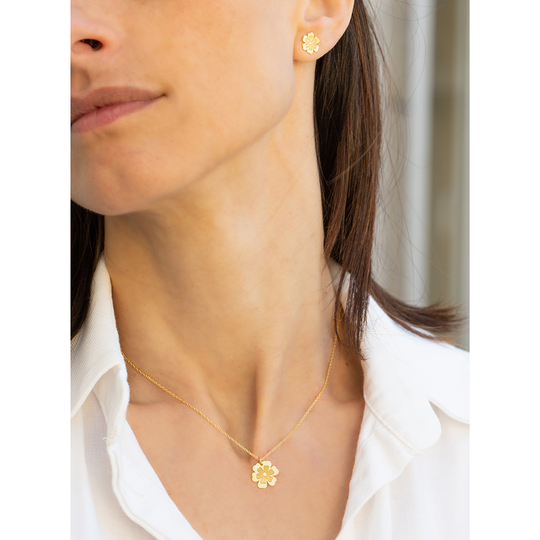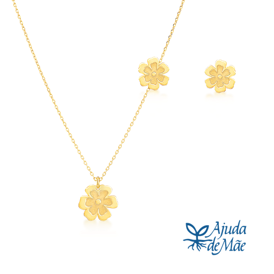 Conjunto de colar e brincos em prata 925 dourada com design do Lugar da Jóia. Colar ajustável com pendente em forma de flor. Brincos pequenos em forma de flor, com fecho de espeque. Produção nacional. Na compra destas jóias está a contribuir com 3 euros para a associação Ajuda de Mãe.