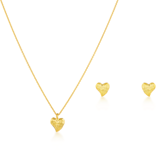 Conjunto de colar e brincos em prata dourada com pequeno coração com delicado volume texturado. Colar ajustável. Brincos pequenos com fecho de espeque.