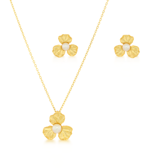 Conjunto em prata dourada com pérolas de água doce. Leve, elegante e perfeito para o dia a dia ou para oferecer com significado.