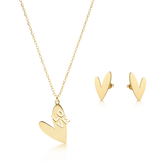 Um conjunto em prata dourada que celebra o amor com um design leve e moderno. O colar com a palavra LOVE e os brincos em forma de coração são o detalhe perfeito para quem gosta de expressar sentimentos com estilo. Brincos: 12x8mm