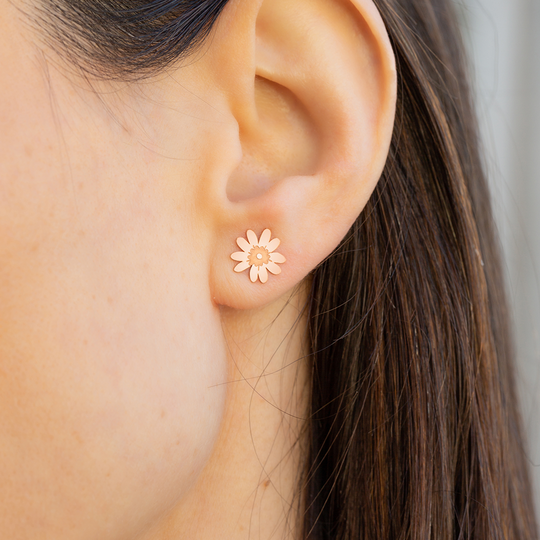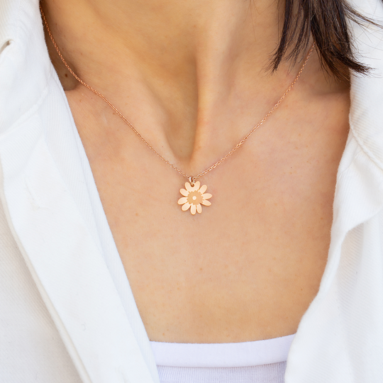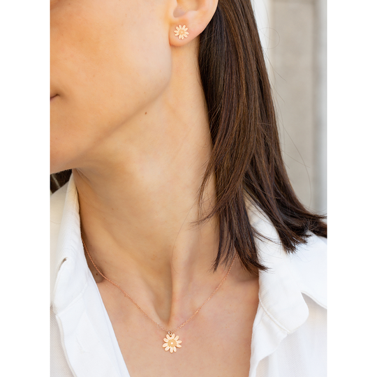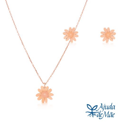 Conjunto de colar e brincos em prata 925 rosa com design do Lugar da Jóia. Colar ajustável com pendente em forma de flor. Brincos pequenos em forma de flor, com fecho de espeque. Produção nacional. Na compra destas jóias está a contribuir com 3 euros para a associação Ajuda de Mãe.